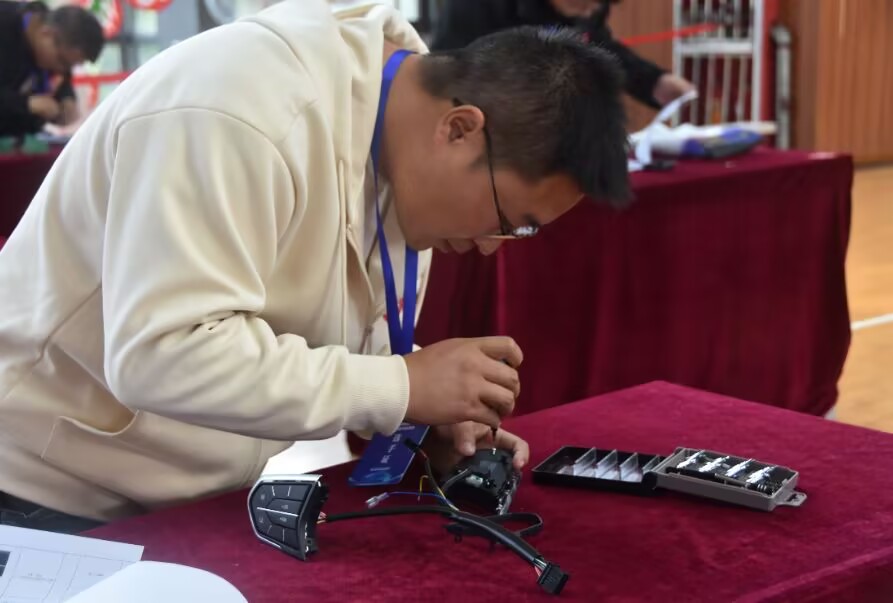 本次竞赛紧密结合新能源汽车产业技术发展趋势和企业生产实际需求,既考验选手的专业理论功底,更注重实践应用与创新能力。竞赛现场,选手们精神饱满、沉着应战。机械成图赛道上,指尖在键盘与鼠标间飞速流转,屏幕上精准呈现的工程图纸彰显扎实功底;装配技能区里,选手们手持工具仔细调试零件间隙,通过“看、测、装、检”四步法确保每一道工序符合工艺要求。裁判团队严格遵循“公平、公正、公开”原则,从操作规范、工艺精度、完成效率等多维度综合考评,确保竞赛结果的权威性。