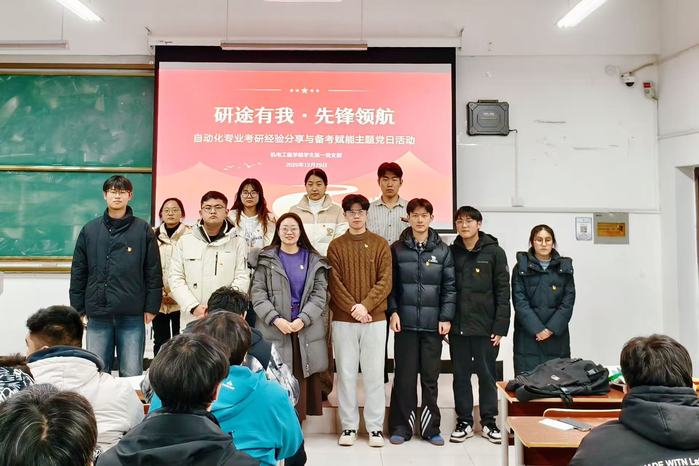 为深入学习贯彻习近平新时代中国特色社会主义思想和党的二十届四中全会精神,充分发挥学生党支部战斗堡垒作用和党员先锋模范作用,12月29日晚,太阳集团tyc151cc学生第一党支部在文端楼举办“研途有我·先锋领航”自动化专业考研经验分享与备考赋能主题党日活动。